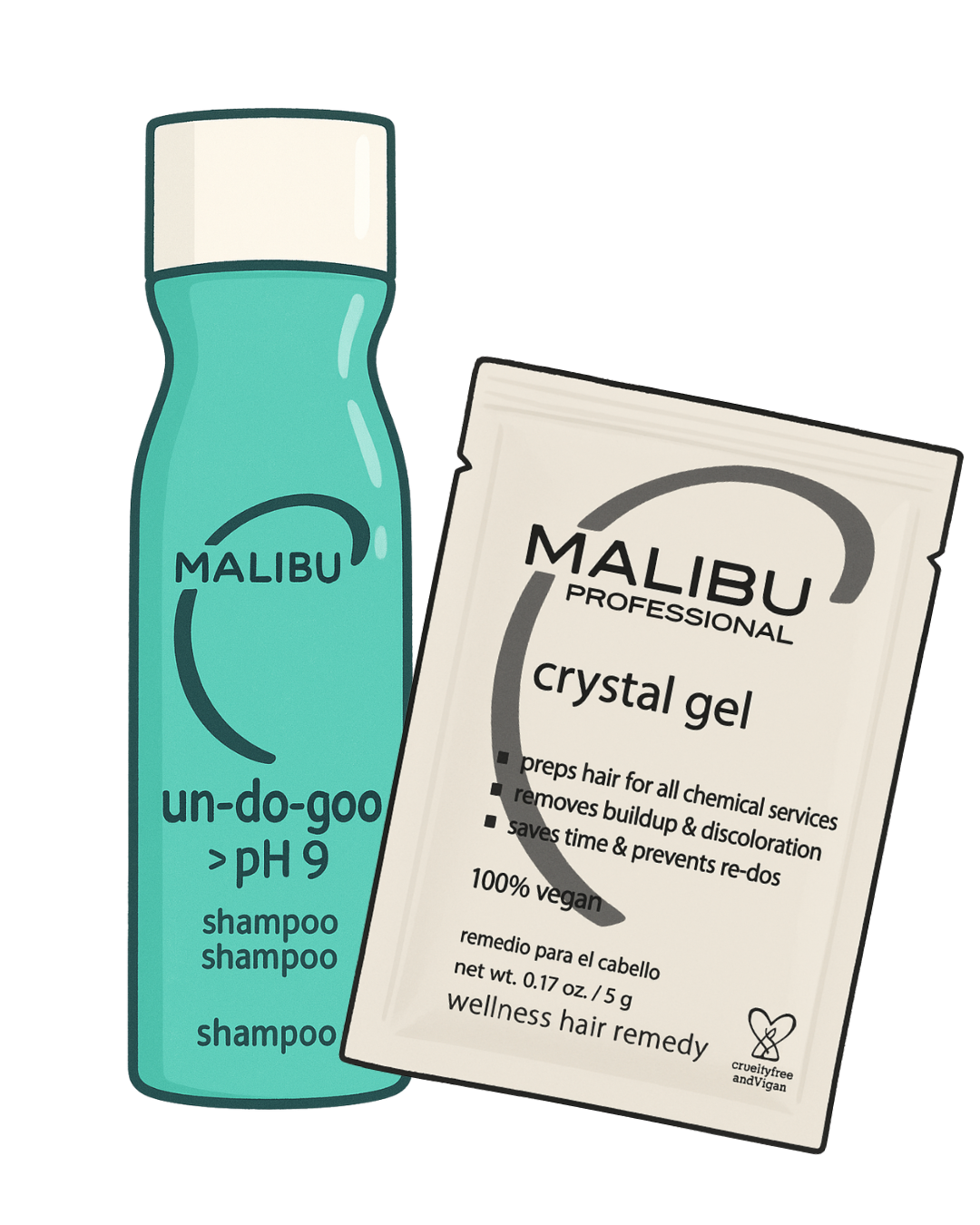 Once the hair was free of product film, I moved into chelation using Malibu Crystal Gel or the Malibu Hard Water packet, depending on the client and their water exposure. Hard Water was my default in mineral-heavy areas where calcium, magnesium, copper, and iron were common. Crystal Gel was reserved for deeper resets — well water, discoloration, or stubborn buildup that didn’t release easily.